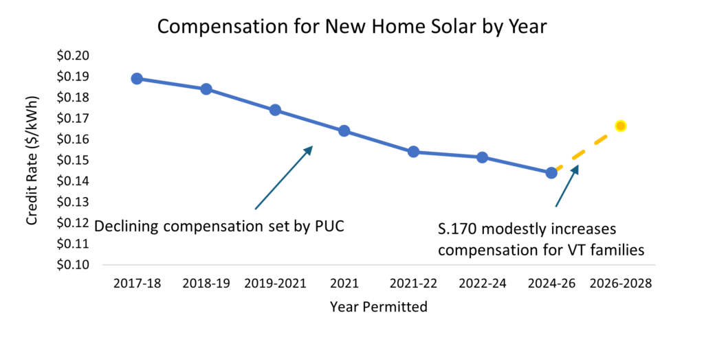 Fortunately, Senator Watson is doing her part to make sure that solar remains viable for Vermont families. Under the state’s net-metering program, Vermont families receive a credit on their utility bill when they generate more electricity than they use. The value of this credit is set by the Public Utility Commission, which has used a negative “siting adjustor” to reduce the value of these credits seven times since 2017. Senator Watson’s bill, S.170, would instruct the PUC to freeze these adjustors until 2028, allowing the compensation for net metering customers to grow as rates increase.